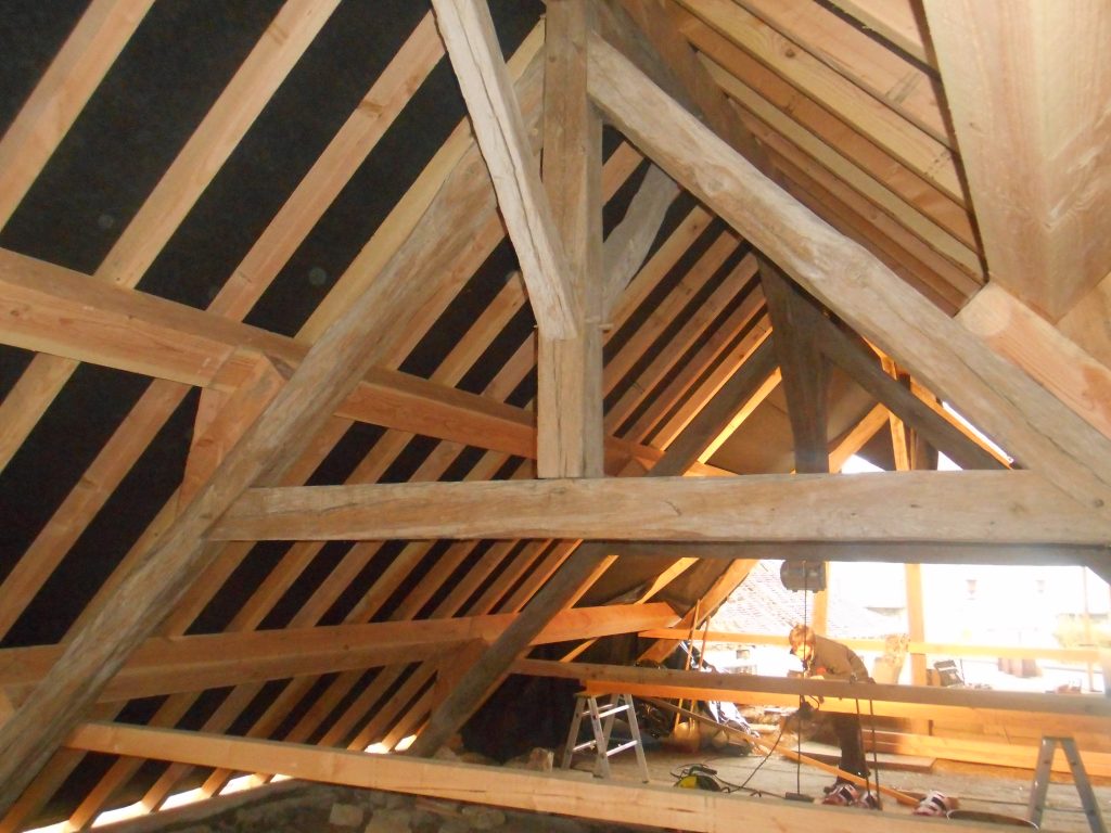 Nous maîtrisons les contraintes spécifiques liées aux chantiers patrimoniaux : sélection rigoureuse des matériaux d’origine (chêne, petites tuiles plates, zinc façonné à la main), techniques de pose traditionnelles, et respect des exigences réglementaires propres au patrimoine protégé.